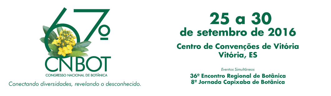 O 67º Congresso Nacional de Botânica, realizar-se-á no período de 25 a 30 de setembro de 2016, no Centro de Convenções de Vitória, na cidade de VITÓRIA, Espírito Santo, Brasil.